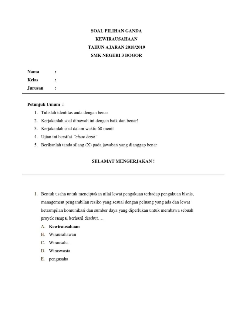 150 soal pts prakarya dan kwu kelas 11 semester 1. 50 soal kewirausahaan kelas 10 lengkap dengan jawabannya contoh soal essay . Dan essay semua bab 1, 2, 3, 4, 5, 6, 7 dst beserta kunci jawabannya . Mengapa dalam acara usaha, perlu diadakan taktik promosi yang tepat? Pengelolaan sumber daya usaha di kenal dengan istilah 6m yaitu .